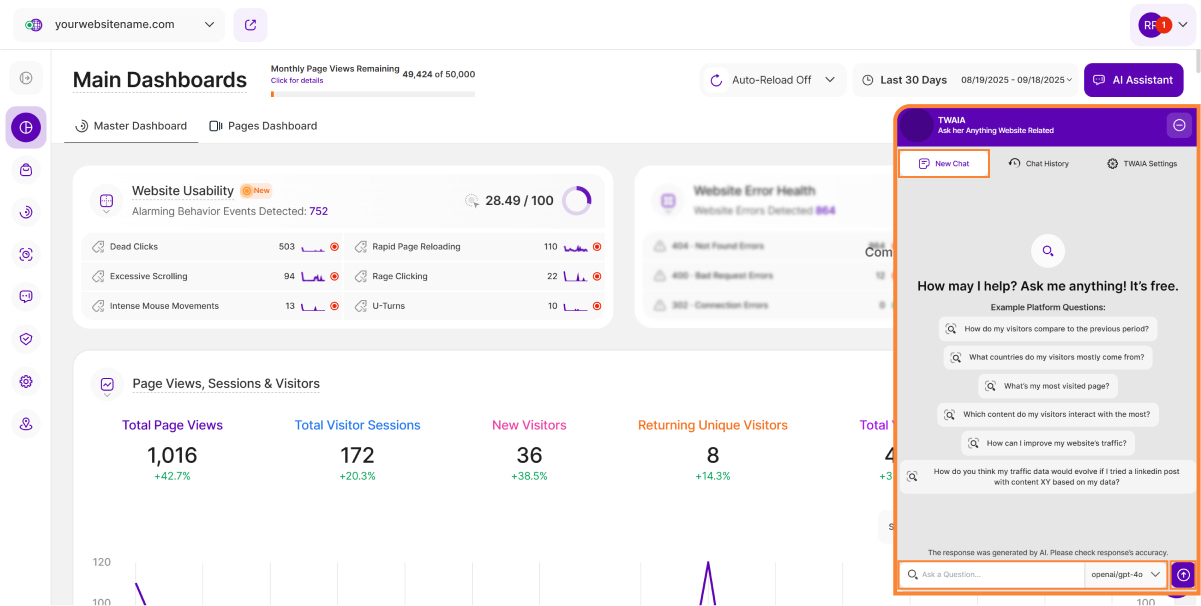 The AI Assistant button is in the top-right corner of the dashboard, right next to the date picker. When clicked, this button will open a modal sliding in from the right that hosts TWAIA, our AI-powered platform assistant.