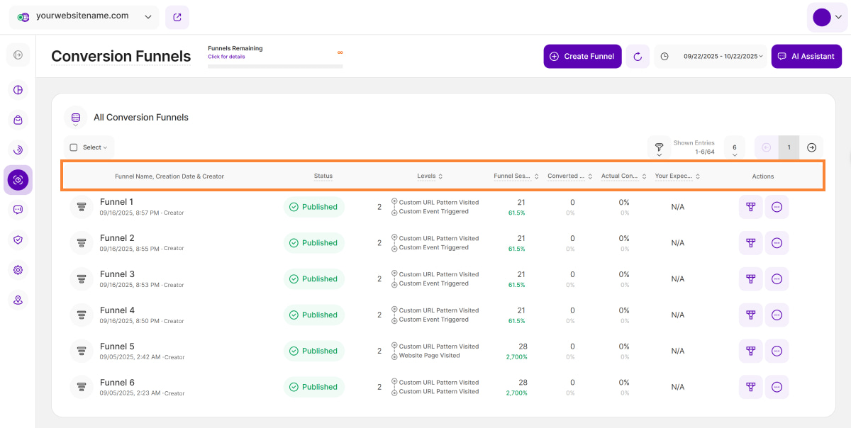 - Your Expected Conversion Rate: This column shows a funnel's expected conversion rate that you manually defined for a funnel during its setup. You can update the expected conversion rate anytime based on your needs.