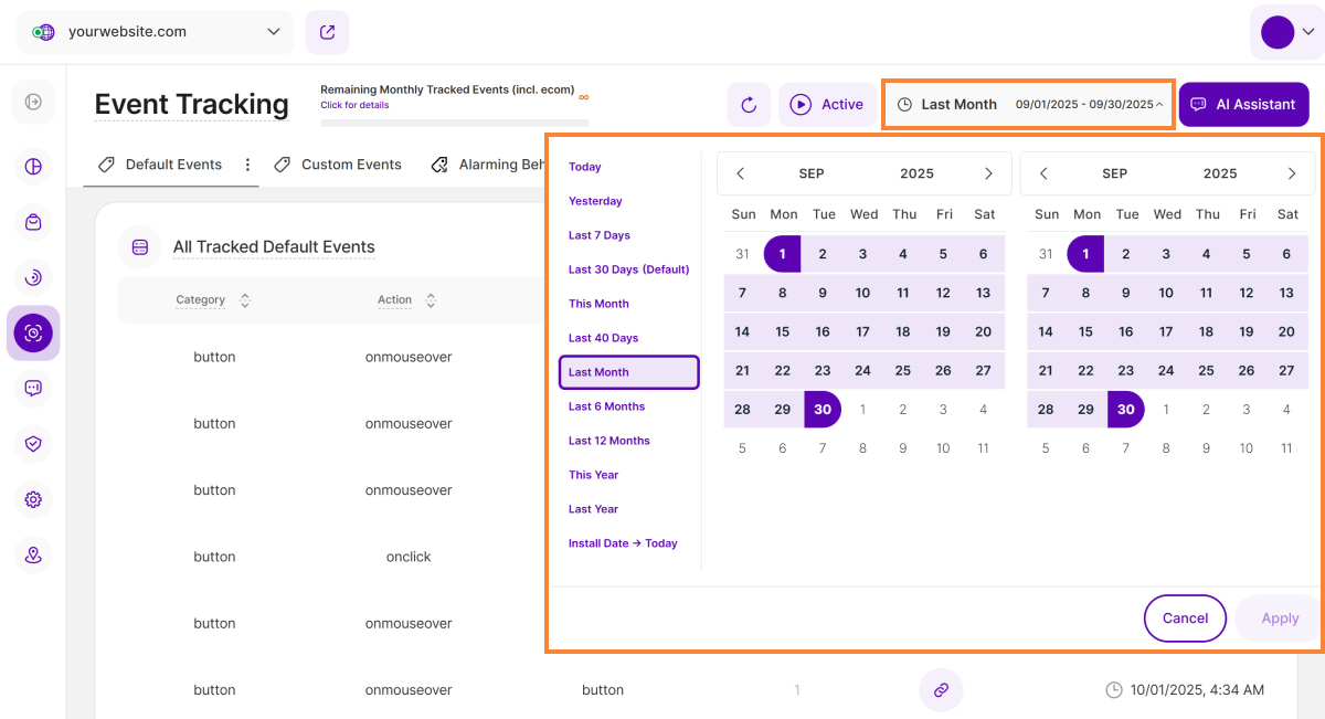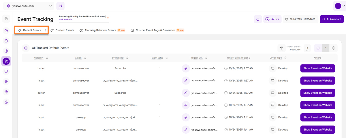 The Default Events tab provides a complete overview of every default event triggered by website visitors within the specific timeframe you selected. It is split into two insightful sections: