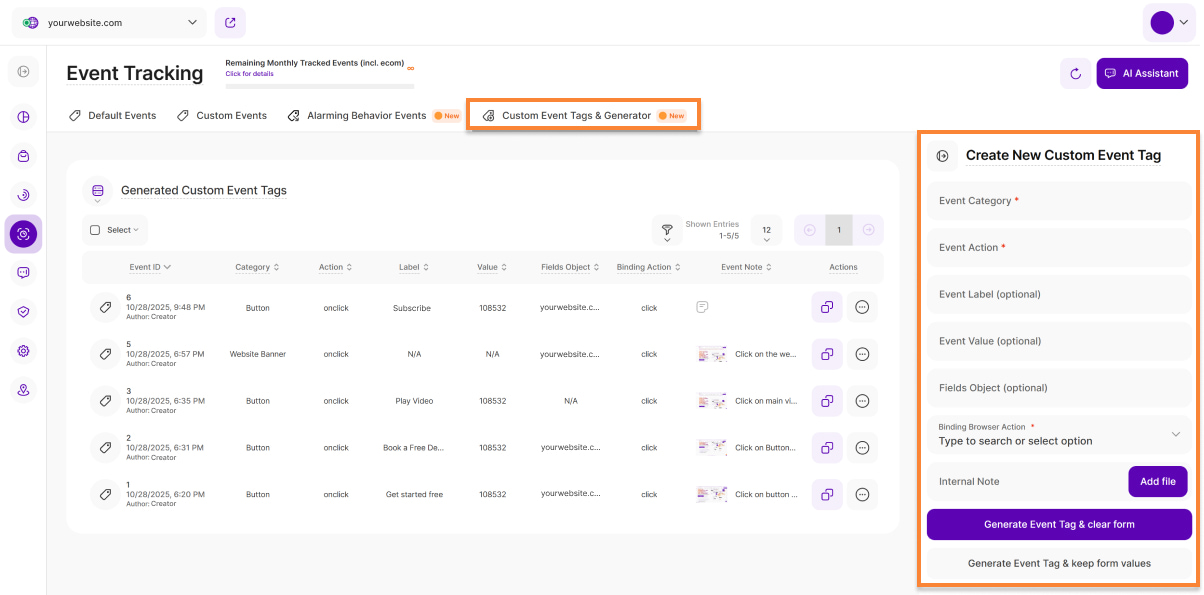 - Event Note: This column displays any notes that a contributor may have added to the custom event when creating it using the platform's custom event tag generator. This can help to better understand the context of a specific custom event (e.g., in teams).