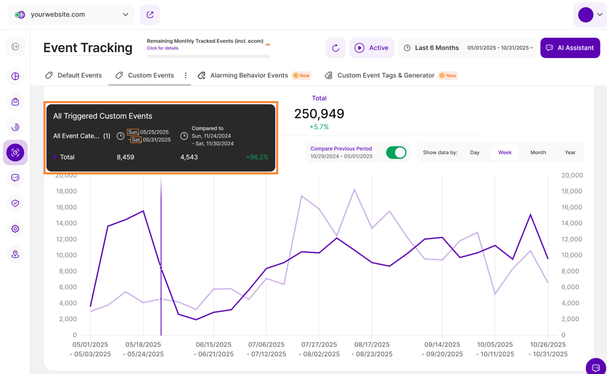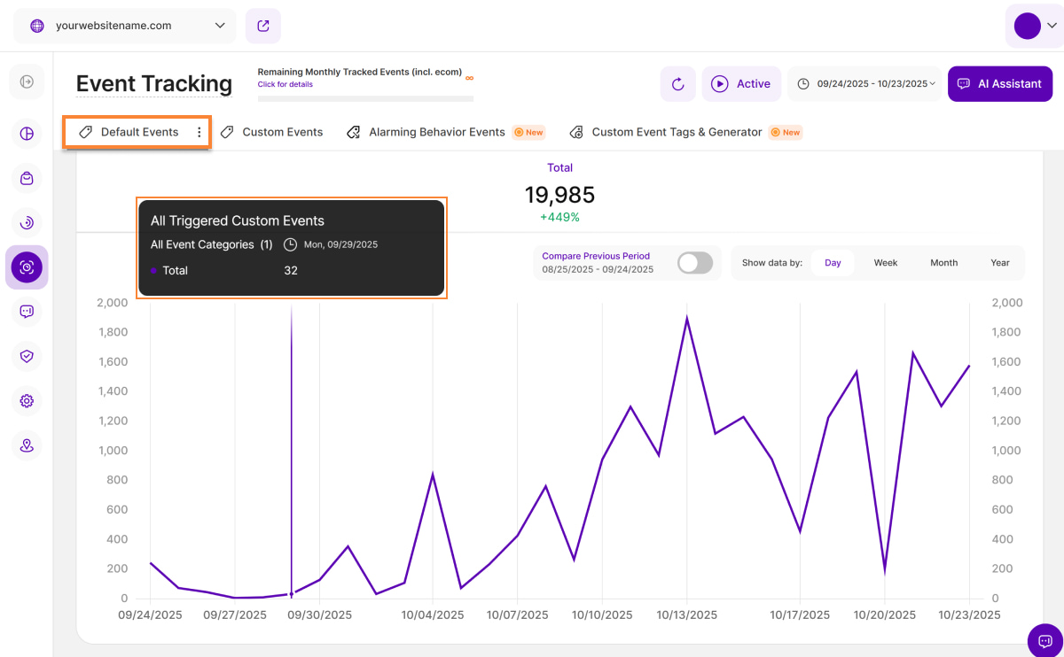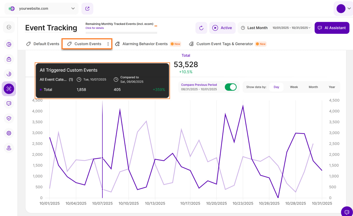 Similar to the Default Events view, you'll find a radio button labeled 'Compare Previous Period' on the top right of this section (with the corresponding dates underneath). This button lets you compare your current data to the equivalent time period before it. The data from that previous period is illustrated by a light purple line on the diagram.
