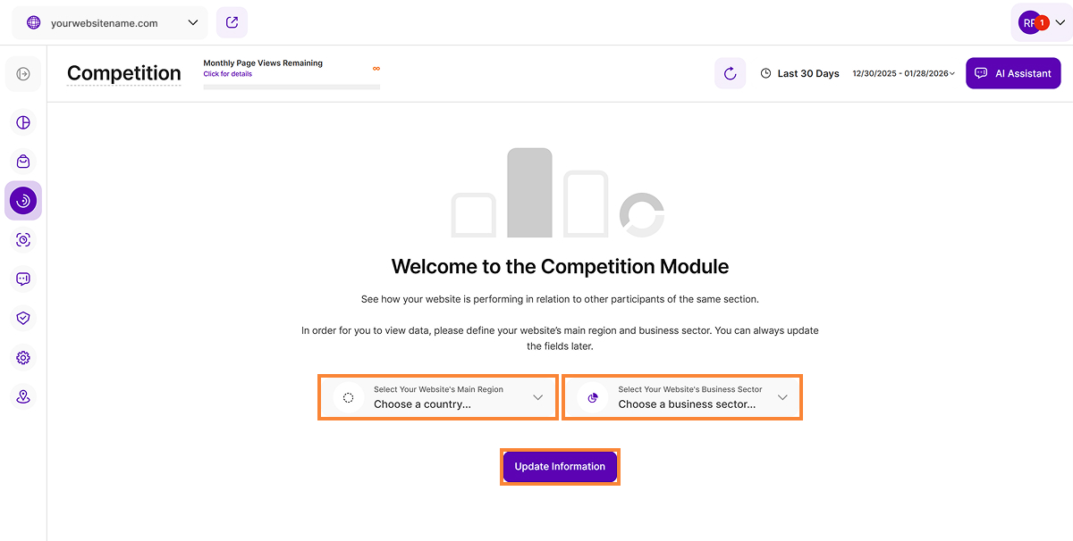 The Competition module helps you compare your website's performance with other sites in your industry and region. When you select Competition from the main navigation bar for the first time, a welcome screen will appear. To begin viewing data, define your website's main region and business sector, then click Update Information. You can always update the fields later.