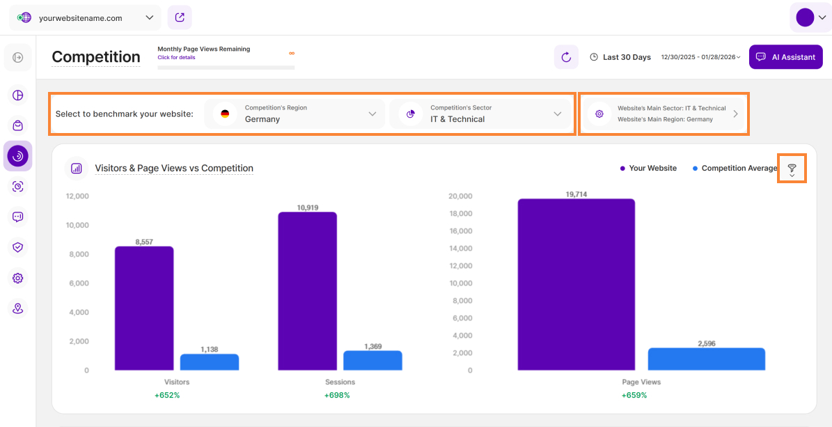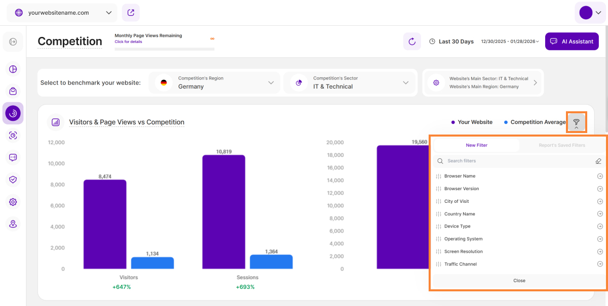 The Competition submodule provides invaluable insights, and filters are the key to unlocking a granular understanding of your performance. They are consistently available across all report blocks, giving you the power to apply one or more at once to segment and analyze your website's data with high precision.