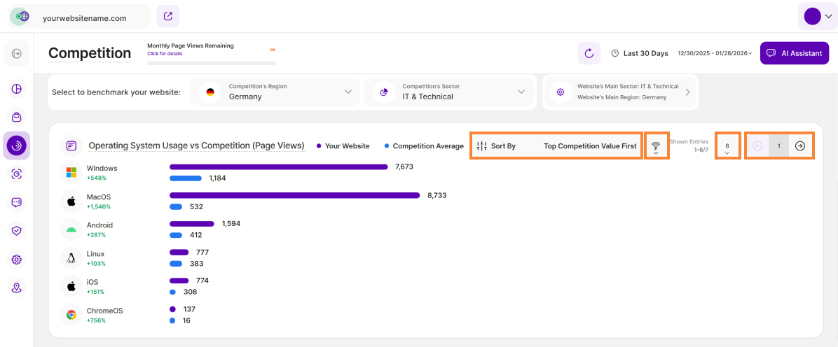 - Competition Average (Blue Bar): The average number of page views generated by visitors using that Operating System across all websites in your defined competition group.