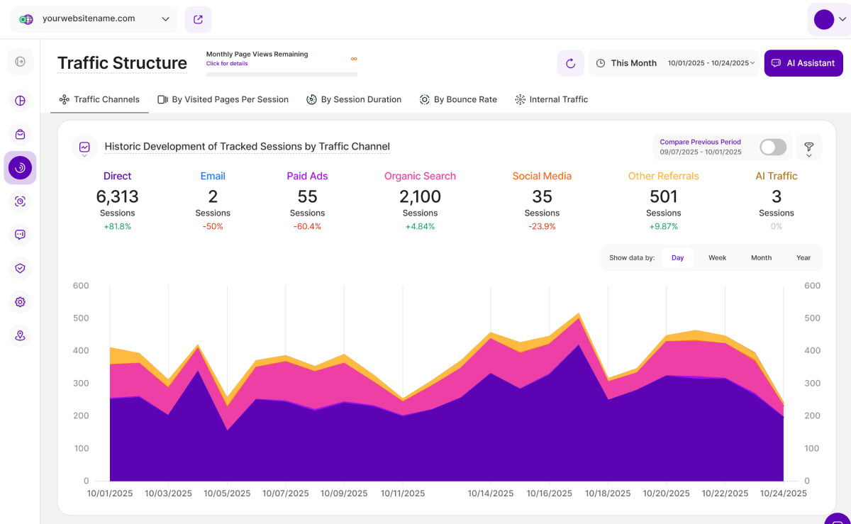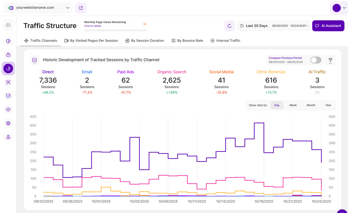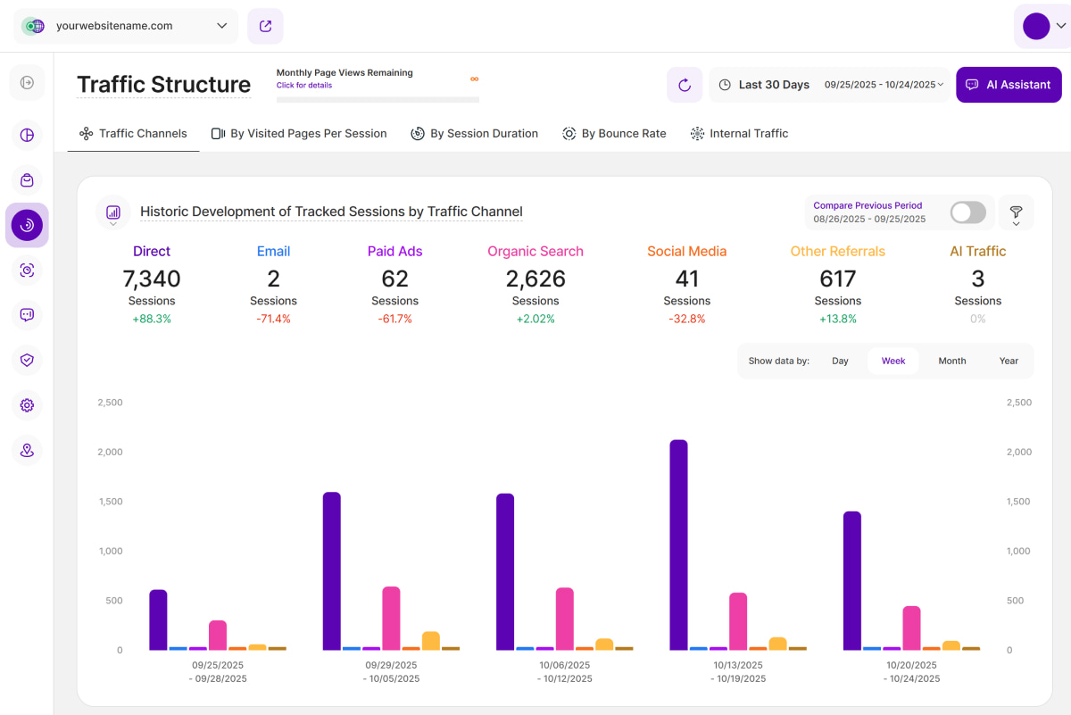 With a foundational understanding of your web traffic channels, you can now analyze traffic share trends by source. Each tab within the Traffic Structure submodule focuses on a particular aspect of the Historic Development of Tracked Sessions by Traffic Channel. The contained report blocks visualize how Key Performance Indicators (KPIs) have evolved over the chosen timeframe, segmented by traffic channel.