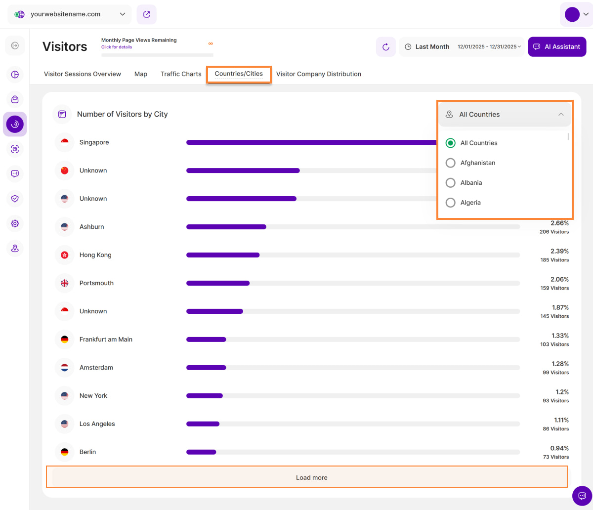 The Countries/Cities tab acts as an extension of the map view. It is composed of two report blocks that display all the countries and cities that generate visitors or traffic for your website. Countries and cities generating the highest number of visitors are listed first.