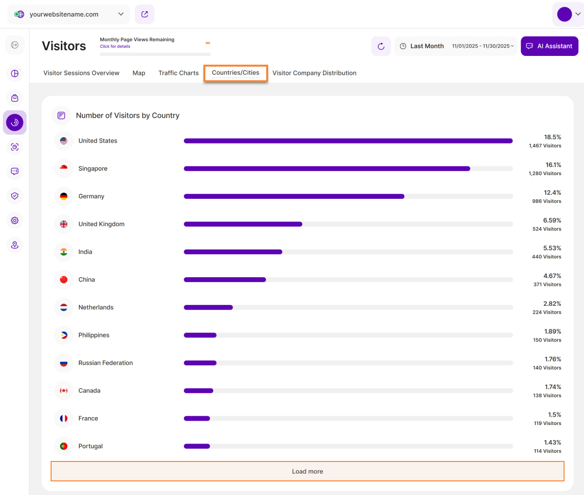 - Percentage: The percentage shown next to each bar indicates the proportion of total visitors attributed to that particular country, helping you gauge the relative contribution of each country to your overall web traffic.