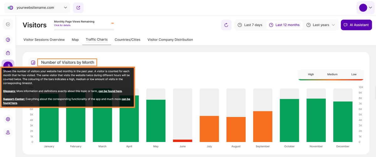 - Number of Visitors by Month: Shows the number of visitors your website had monthly in the selected year. A visitor is counted for each month that he has visited. The same visitor that visits the website twice during different hours will be counted twice. The colouring of the bars indicates a high, medium or low amount of visits in the corresponding timeslot.