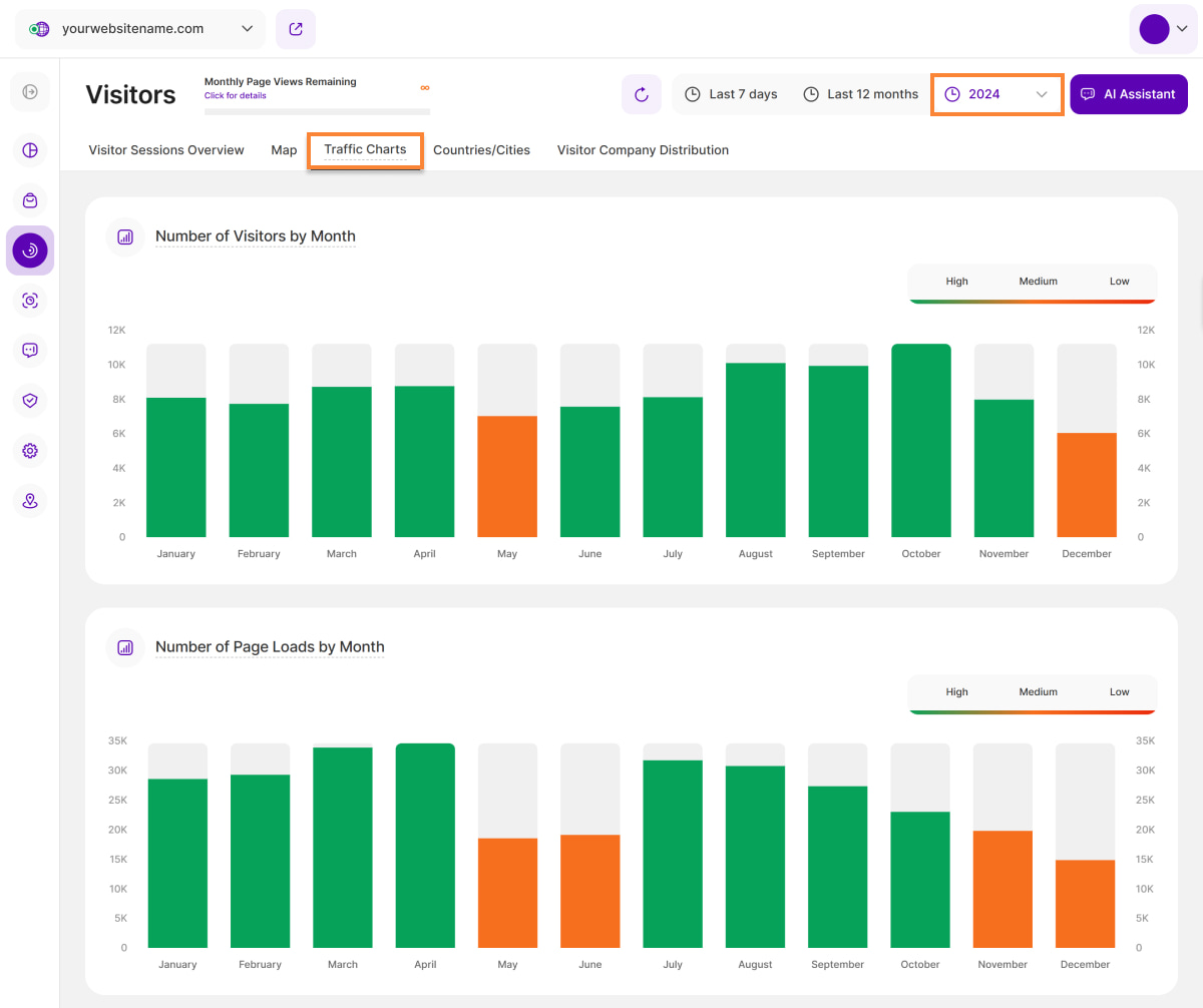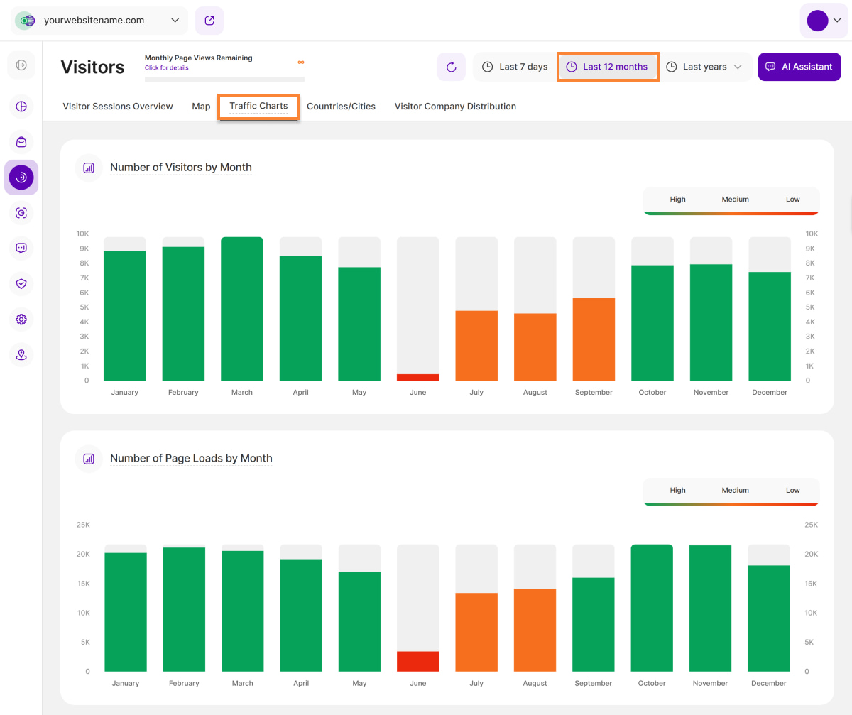 - Number of Page Loads by Month: Shows the number of page views your website had monthly in the selected year. This supports the data of the graph "Number of Visitors by Month".